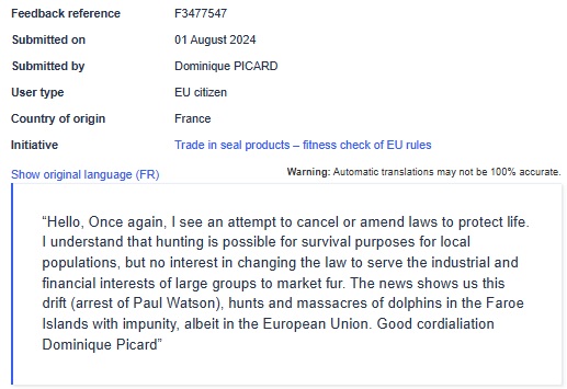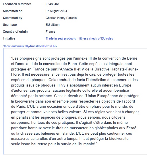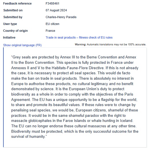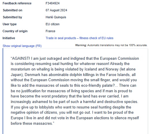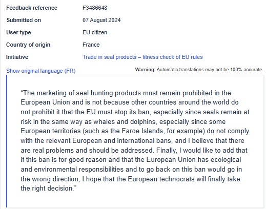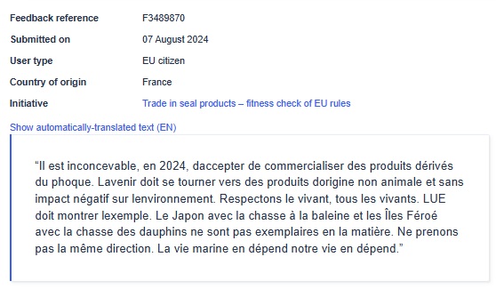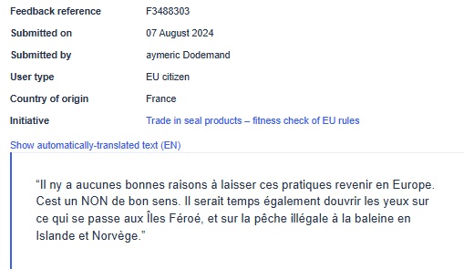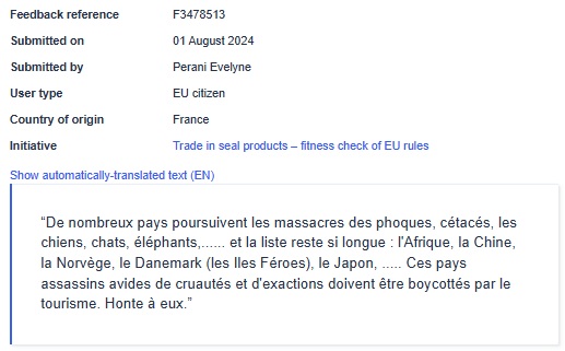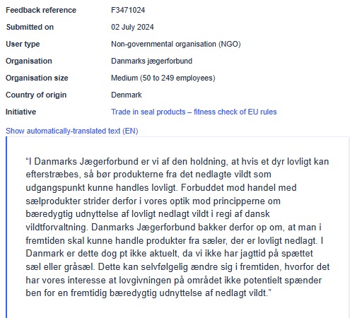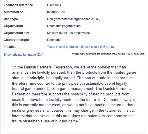 The statistics page for the consultation states that there were 11 contributions from Denmark. However, when the search term “Denmark” is used in the “filter for reviews” search portal for the feedback, as of the research and publication of this piece, only of the results shown are contributions by Danish-based contributors to the 2024 EU trade on seal products fitness check public consultation process. When the term “Danmark” is used, only one result shows; a result that is also one of the three results from the “Denmark” search. These results are below (English and Danish [when original language of submission]) in the slideshow, with two attachments provided with two of the three submissions.