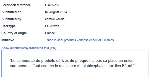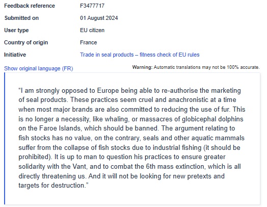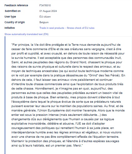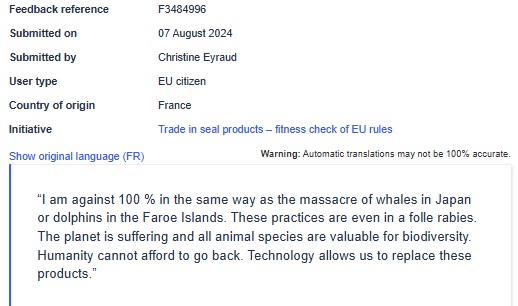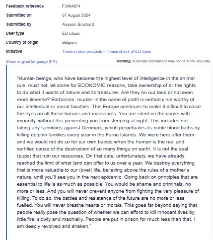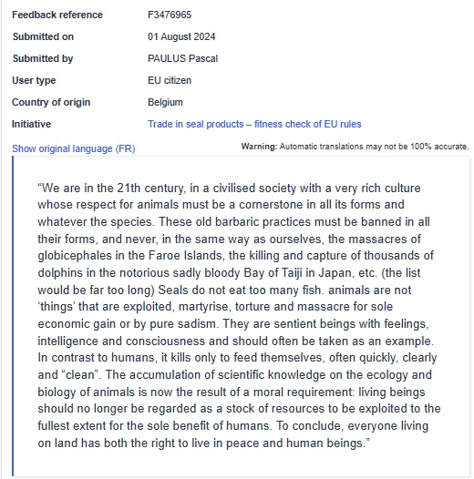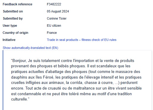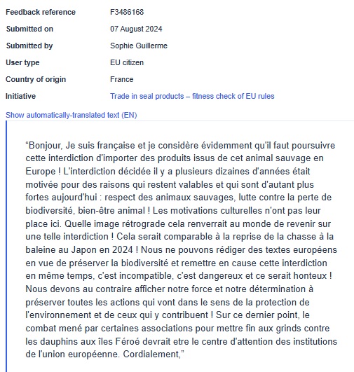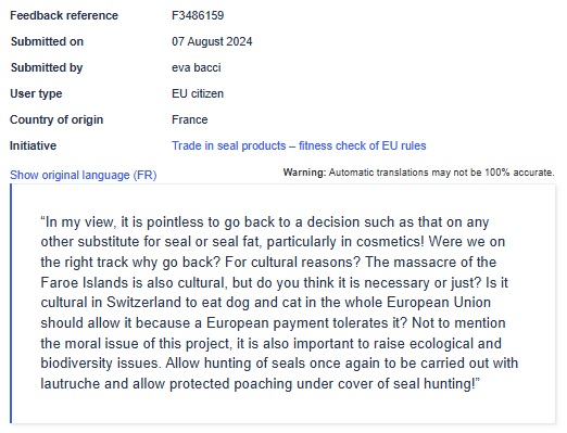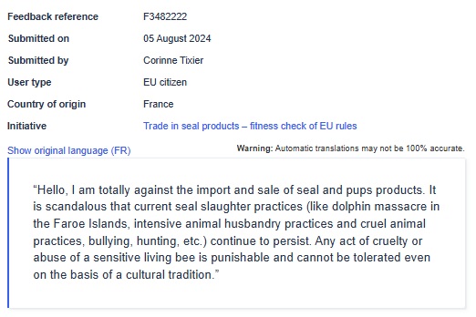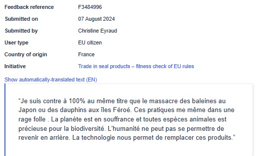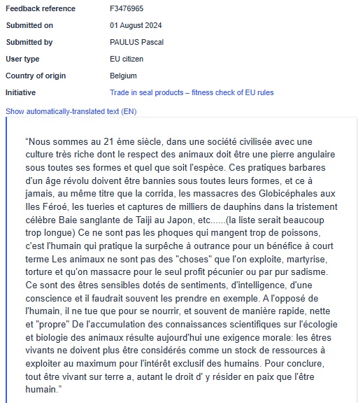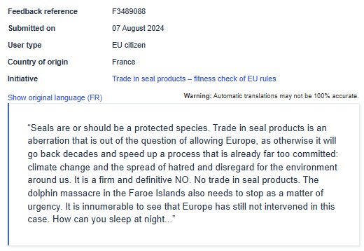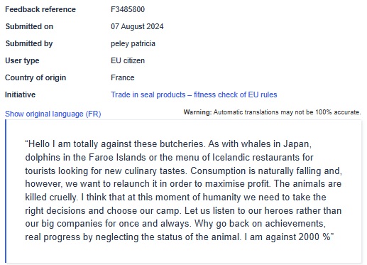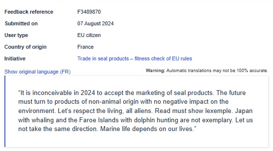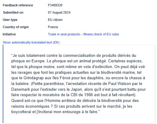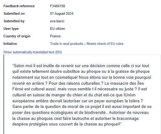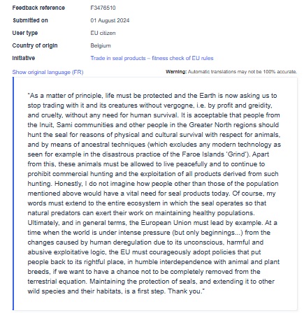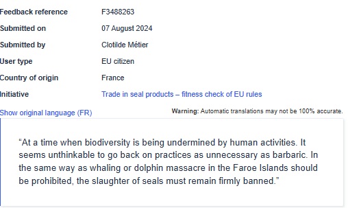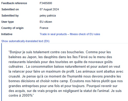 Methodology: Screen shots of public consultation comments and downloadable attachments were obtained from the “Trade in seal products – fitness check of EU rules” public consultation feedback. The consultation feedback is open access. You can find out more about the consultation process here: https://ec.europa.eu/info/law/better-regulation/have-your-say/initiatives/14031-Trade-in-seal-products-fitness-check-of-EU-rules/public-consultation_en.