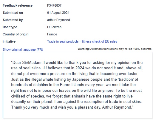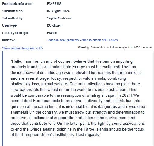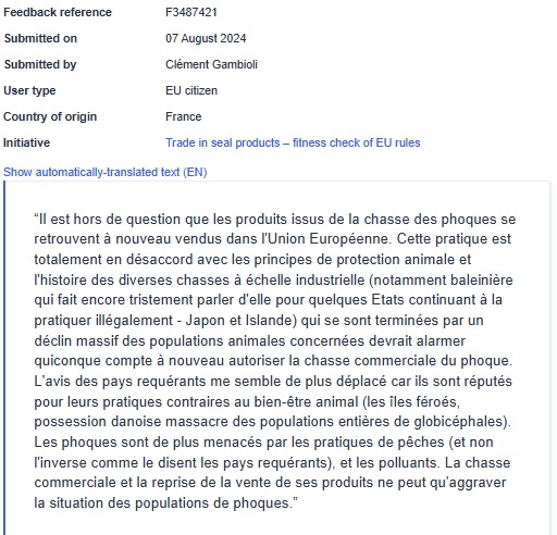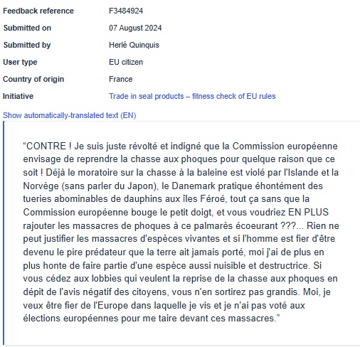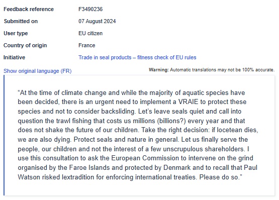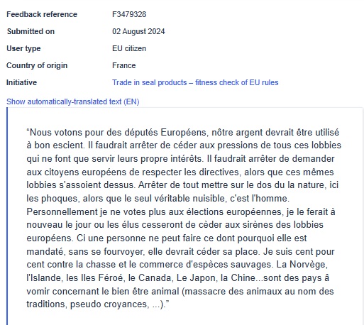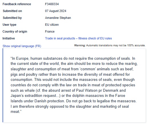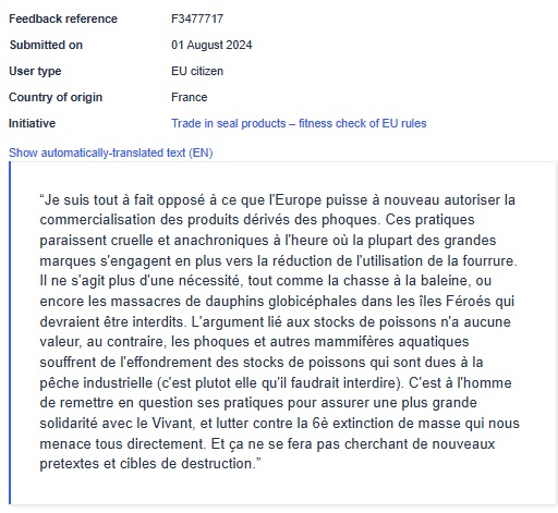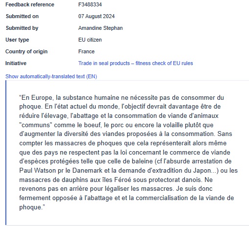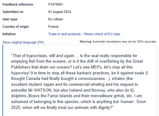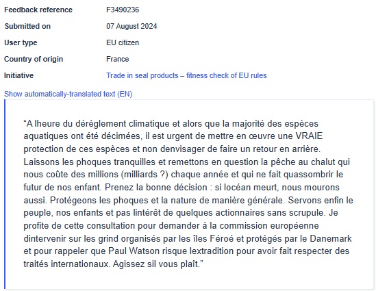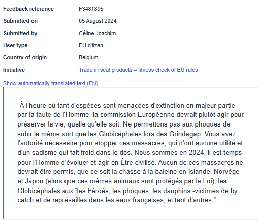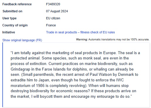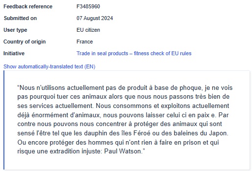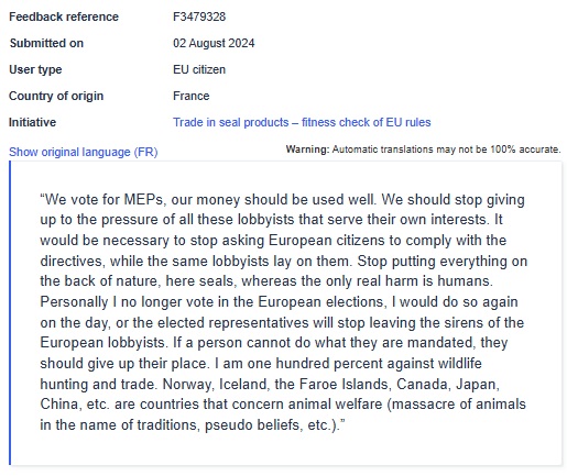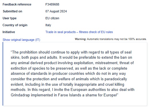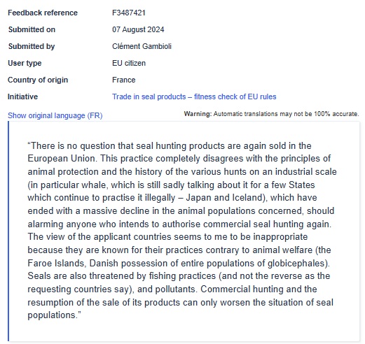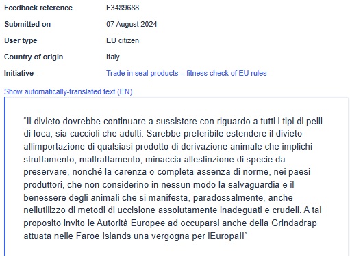 Methodology: Screen shots of public consultation comments and downloadable attachments were obtained from the “Trade in seal products – fitness check of EU rules” public consultation feedback. The consultation feedback is open access. You can find out more about the consultation process here: https://ec.europa.eu/info/law/better-regulation/have-your-say/initiatives/14031-Trade-in-seal-products-fitness-check-of-EU-rules/public-consultation_en.