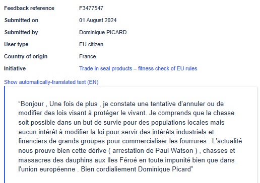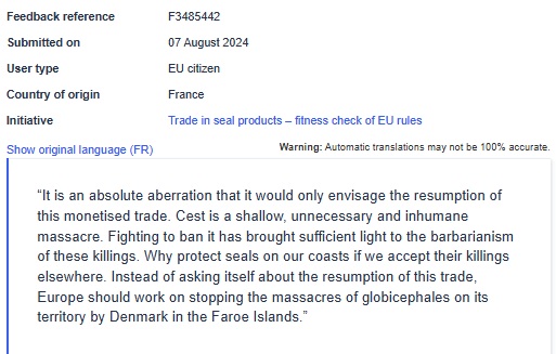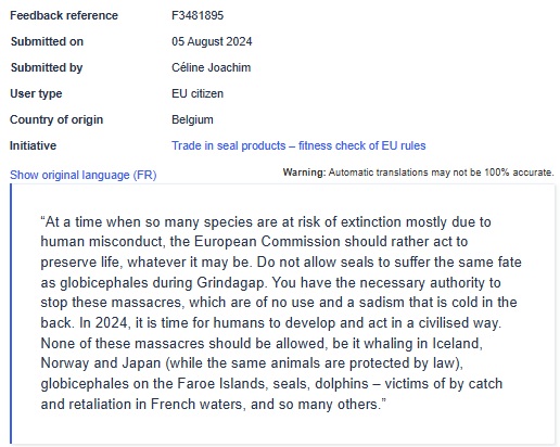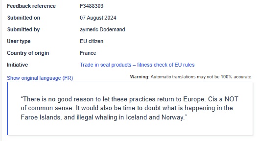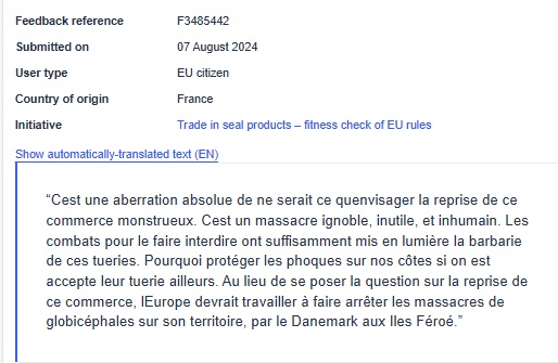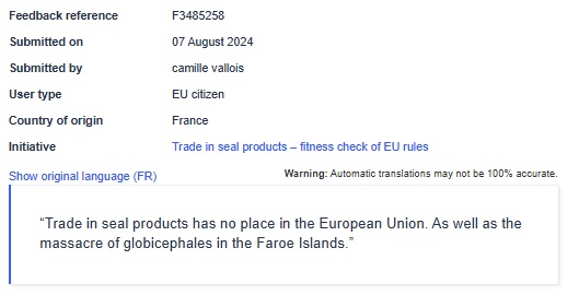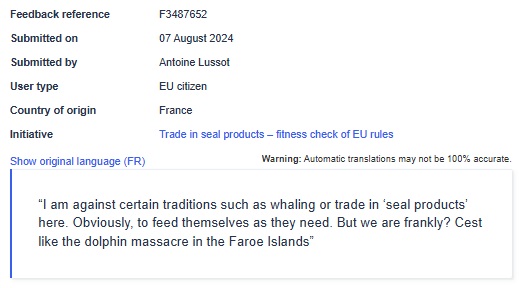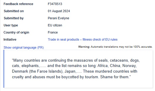 Of contributors mentioning the Faroe Islands, there is a vocal number that appear intent on using the seal ban fitness check consultations as an opportunity to push for a broader call from wider bans on traditional hunting practices. Of the 33 results mentioning the Faroe Islands, all were against hunting and amending the EU ban on seal products. They also tie their opposition to sealing to a broader call for an end to the traditional Faroese grindadráp. Feedback contributors mentioning the Faroe Islands predominately come from France (27 of 33), with some feedback from Italy (1 of 33), Belgium (4 of 33) and the United Kingdom (1 of 33). Below is a slideshow of these comments, including original language submissions (where appliable) and English-language versions.